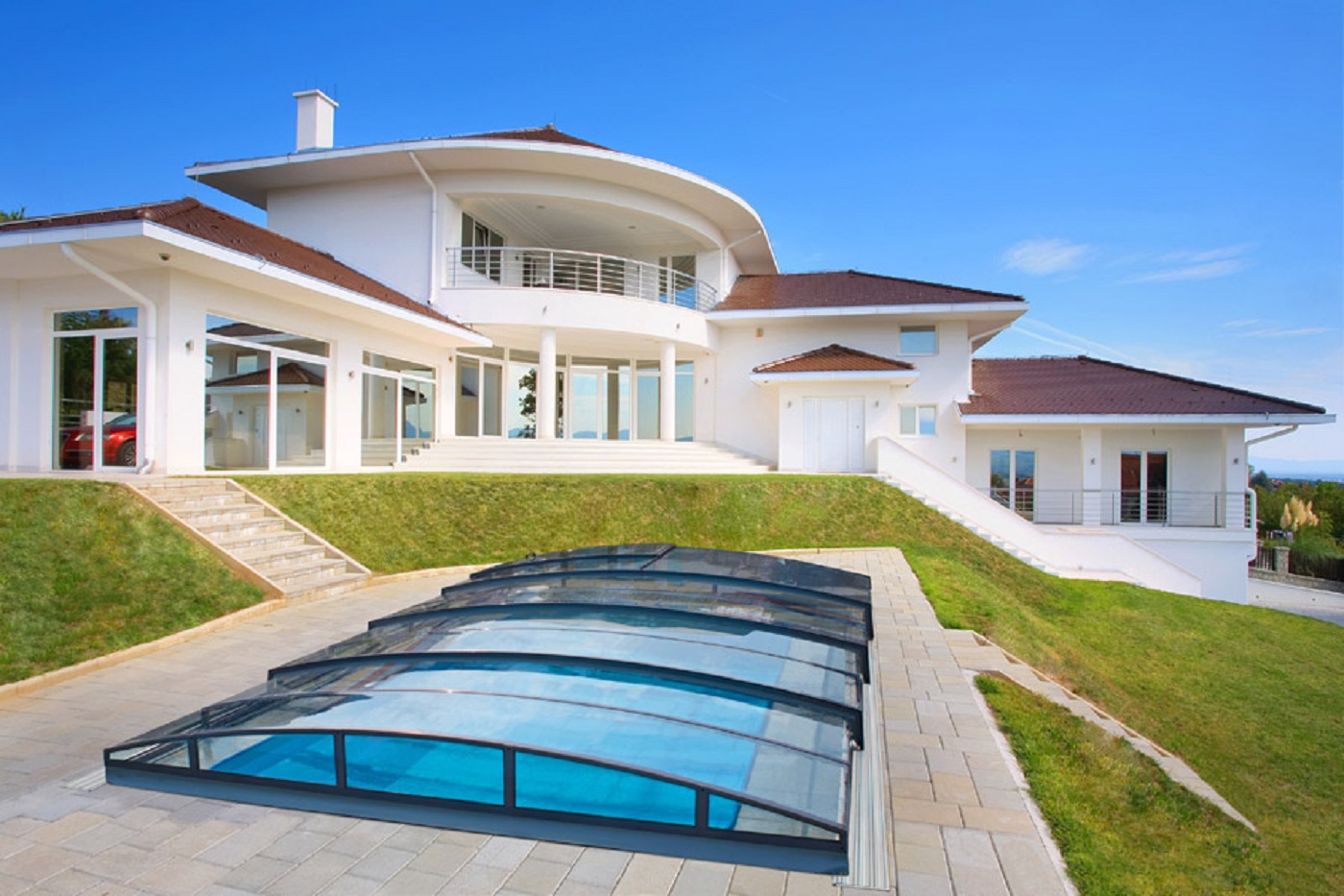De meest complete set met zwembadtechnologie, skimmer en Casablanca Infinity overkapping voorzien van polycarbonaat helder glas.