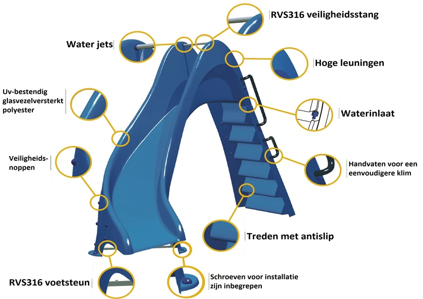 Het biedt hierdoor veel plezier en veiligheid voor alle gebruikers. Deze glijbaan is ideaal voor zowel binnen- als buitenzwembaden, dankzij de weerstand tegen UV-stralen en het 100% gerecyclede en recyclebare materiaal.
