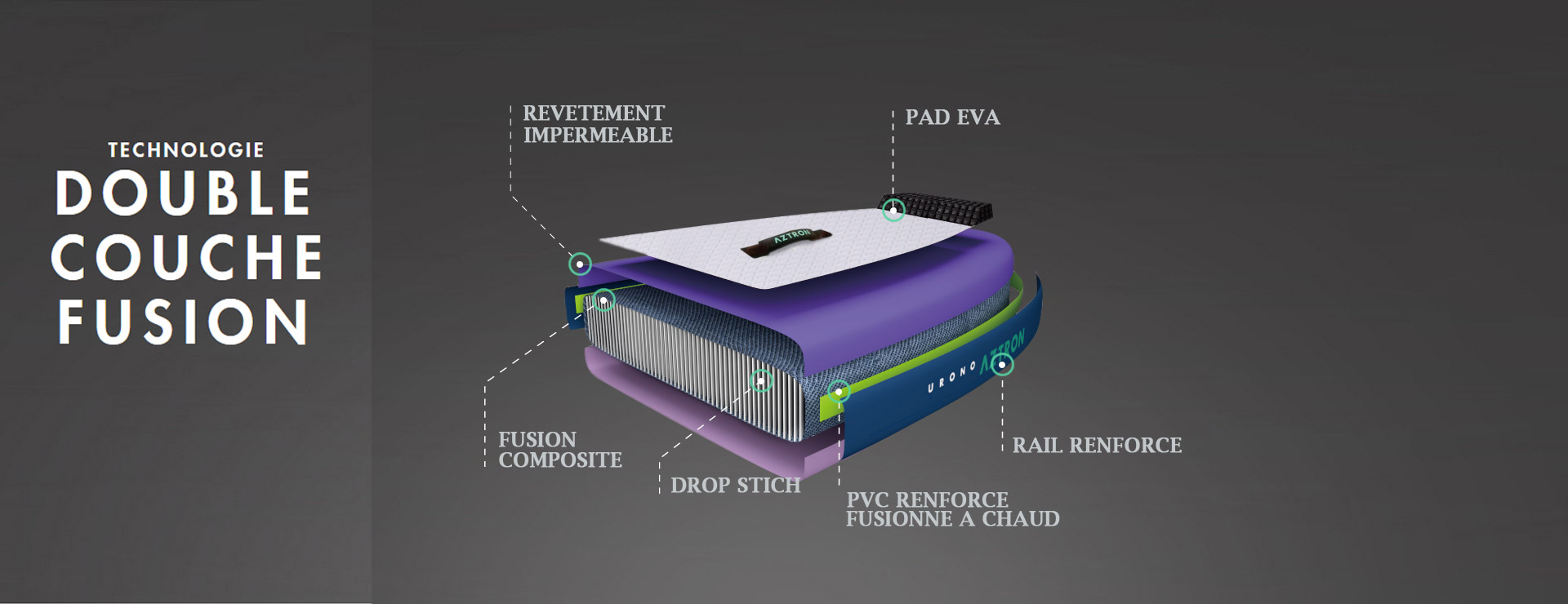 "Extra stijf en ultralicht." Gefuseerde dubbellaagse technologie wordt erkend als het eersteklas constructieproces. Deze hoogwaardige materiaaltechnologie is van toepassing op alle opblaasbare paddleboards van Aztron (behalve de Lunar, Mercury en Titan). Ze zijn uitgerust met een tweede bovenste PVC-laag die door versmelting met de onderste laag is samengevoegd. Ze zijn direct warm gelamineerd op de basislaag en rond de dropstitch. Deze constructie geeft het board ongelooflijke stijfheid voor een ultieme mix van prestaties, kwaliteit en lichtheid.