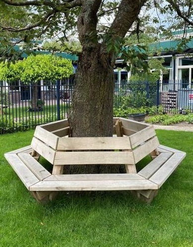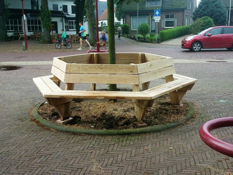 De boombank wordt rondom een boom geplaatst en heeft dus zitplaatsen aan alle kanten met een ideale zithoogte van 48cm.