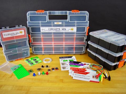 Circuits 101 Sets wordt geleverd met 8 stuks studentenboxen gevuld met elektronica-onderdelen en -benodigdheden. Docenten kunnen gemakkelijk de dozen uitdelen en ons gratis curriculum en onze middelen gebruiken om snel en eenvoudig lessen uit te voeren. Elke set wordt geleverd met een Teacher Box met een volledige set van leveringen, evenals extra batterijen, tape en informatiekaarten. Elke studentenbox is een complete set van leveringen bestemd voor een groep studenten. (We raden groepen van niet meer dan drie studenten aan.)