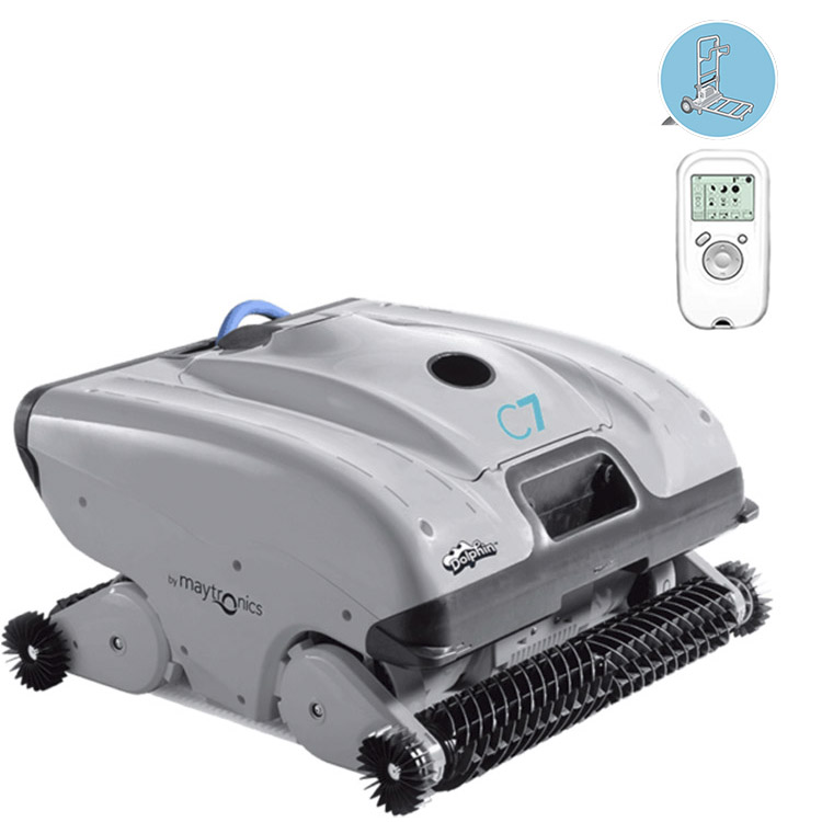 De Dolphin C7 is de meest professionele zwembadreiniger voor de openbare zwembaden. Door het intelligente navigatiesysteem bestaande uit een gyroscoop en een kompas zorgt de C7 voor de ultieme reiniging van uw zwembad. Het toestel is uitgerust met een krachtige pomp van maximaal 34m³/u en kan filteren tot op 100 micron dichtheid. Het toestel wordt geleverd inclusief kabel van 35 meter, een transportwagen en afstandsbediening.