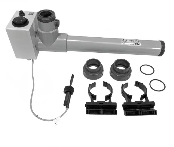 De verwarmingsmantel is gemaakt van chemisch bestendig kunststof. Verwarmingsspiraal van TITANIUM. De verwarming is geschikt voor alle behandelingen van zwembadwater, in het bijzonder voor zout water.