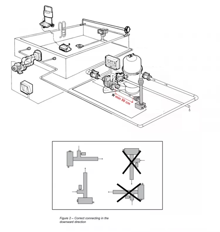 De elektrische verwarming is voorzien van een doorstroomklep. Dit is een veiligheidselement dat ervoor zorgt dat als het zwembadwater niet door de heater stroomt, de verwarmingsspiraal ook niet werkt . Elektrische verwarming mag in geen geval zonder water worden gestart.