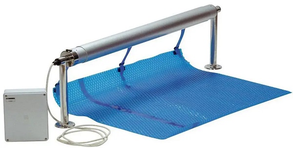 Dit rolluik wordt geïnstalleerd aan de rand van het zwembad, de steunpalen worden vastgezet met pluggen.