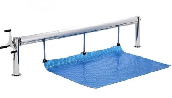 Dit rolluik wordt geïnstalleerd aan de rand van het zwembad, de steunpalen worden vastgezet met pluggen.