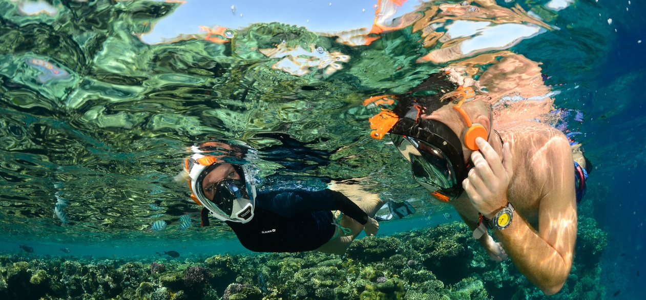 Dit volgelaats snorkelmasker biedt u een panoramisch zicht van 180° op de onderwaterwereld en verbetert het gezichtsveld ten opzichte van traditionele maskers.