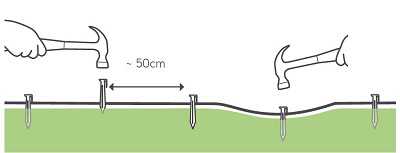 De draadpennen kunnen met een hamer in de grond getikt worden, op ongeveer 50 cm tussenafstand. Zorg dat de draad overal vlak tegen de aarde ligt.