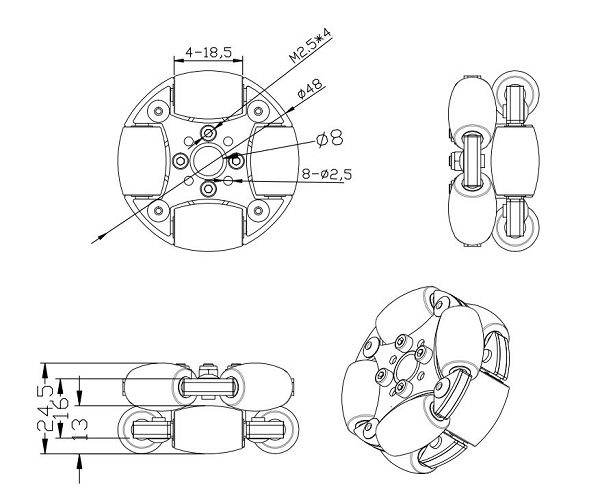 The 48mm Aluminium Double Omni-directional wheels are unique as they are able to roll freely in two directions. It is the smallest size Omni wheel in all of our Aluminm Omni Wheels. The 48mm double aluminium omni wheel is a robust, durable and double row wheel that provides easy 360 degree movement, it includes 8 rollers, made of Nylon and PE, the rollers are mounted along its circumstance and the roller avoid slip.