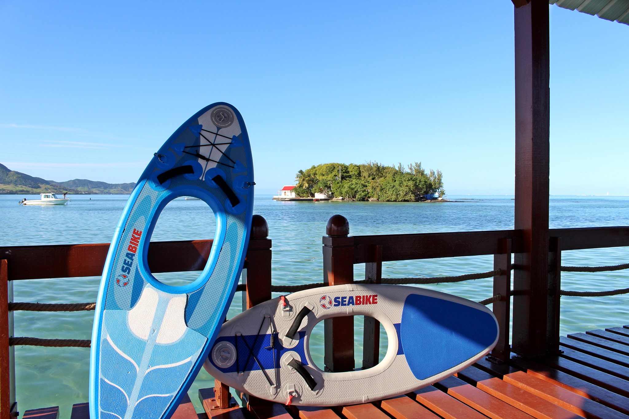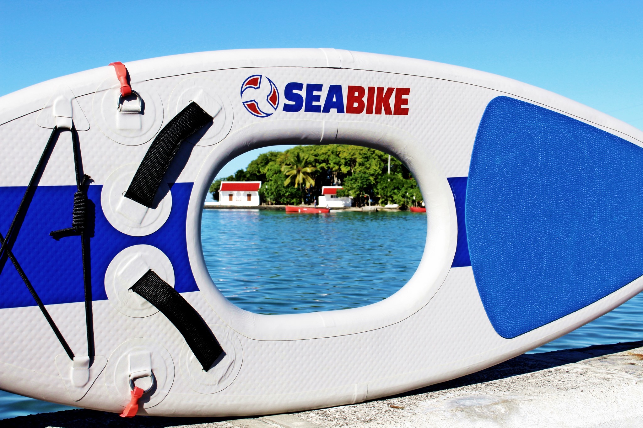 Het opblaasbare board is uitgerust met een speciaal mechanisme om de SEABIKE, een draagbare waterfiets, veilig te bevestigen.