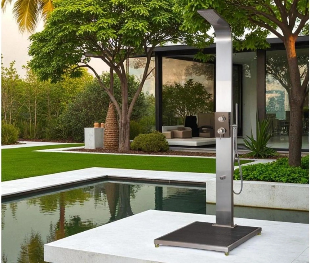 Innovatieve, nieuwe generatie tuindouche, vervaardigd van hoogwaardig V4A roestvrij staal, met WPC-platform, inclusief hand- en hoofddouche, mengkraan, afneembaar achterpaneel, gemonteerd op een grondplaat.