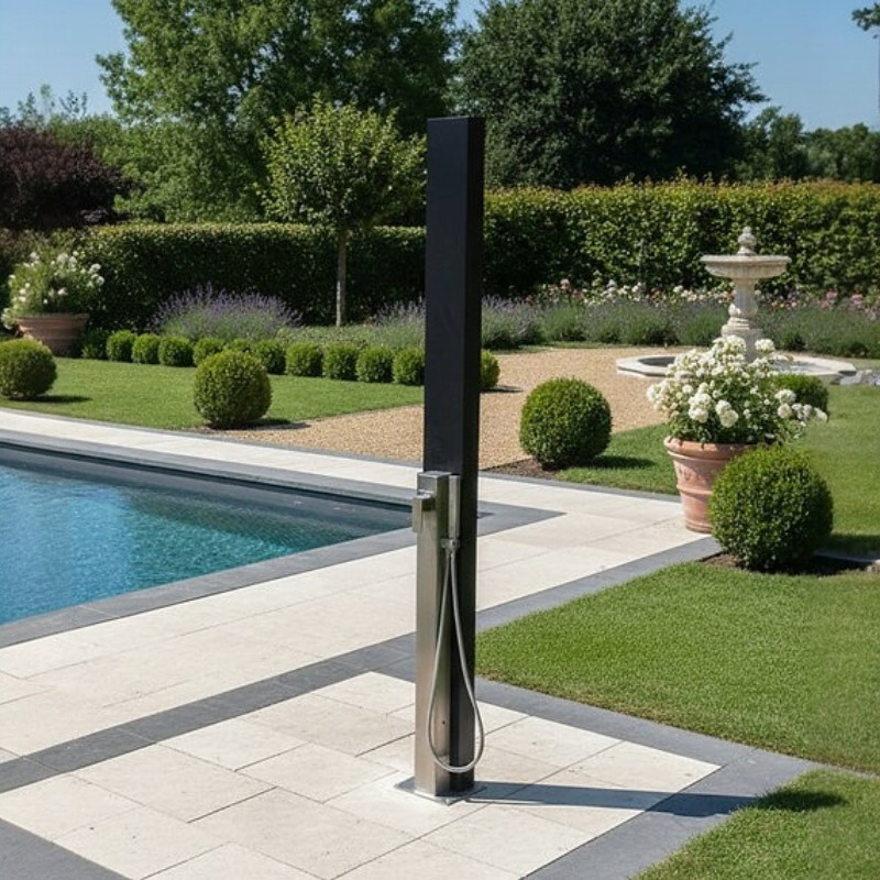 Venus Solar tuindouche met koud en warm water van Ideal Eichenwald De Venus solar tuindouche kenmerkt zich door een eigentijds en open ontwerp. De zwart gelakte watertank vormt een elegante combinatie met de glanzende roestvrijstalen armaturen. De douchekolom herbergt een watertank met een inhoud van circa 25 liter. Dankzij de plaatsing van de tank kan de douche zonlicht van alle kanten opvangen.