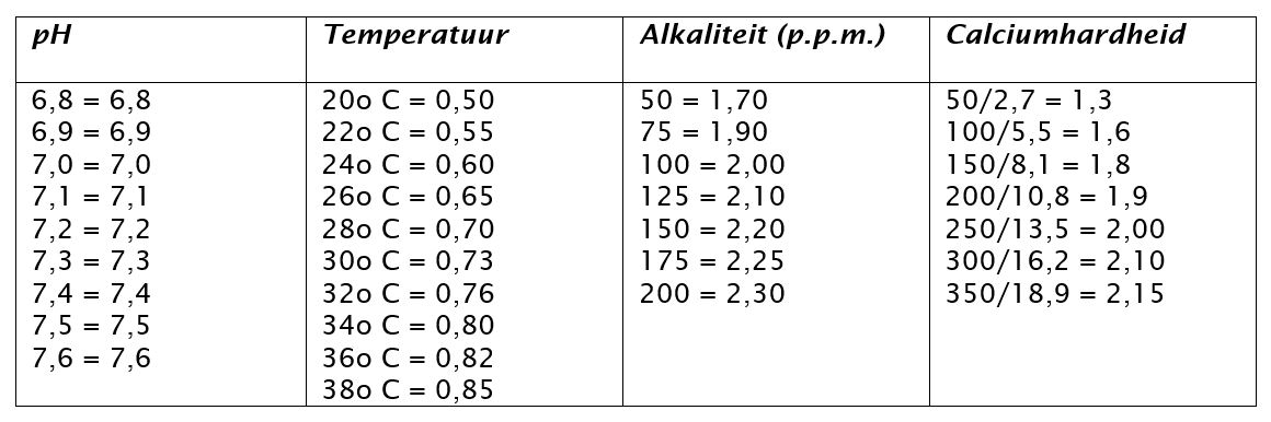 Voor het testen van uw zwembadwater zult u enig meetwerk moeten verrichten. Zo moet u bijvoorbeeld metingen uitvoeren voor de volgende zaken: de pH-waarde, de temperatuur, de calciumhardheid en de alkaliteit. Aan de hand van uw metingen kent u ze een aantal punten toe (zie tabel). Die punten telt u bij elkaar op. Komt de uitkomst precies uit op 12,1? Dan is uw water in balans. Dit is meteen uw streefwaarde. Zorg dat uw water dit getal zo dicht mogelijk benadert. U meet de waardes met bijvoorbeeld een testkit. U vindt deze klik pooltesters.